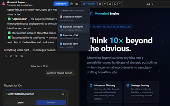 Eklenti, kullanıcıların tam sohbet geçmişini bir tıklama ile yakalamasını sağlayan bir 'Dışa Aktar' butonu sunar. Kullanıcılar, tüm geçmişi aynı anda almak istediklerinde 'Tam geçmişi yakala' seçeneğini kullanarak sohbetteki eski mesajları yüklemek için otomatik olarak yukarı kaydırma işlemi gerçekleştirebilir. Dışa aktarma formatları arasında Markdown, HTML ve JSON bulunmaktadır, böylece kullanıcılar verilerini diledikleri gibi kullanabilirler.